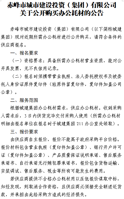 下一篇:赤峰市城市建設(shè)投資(集團(tuán))有限公司 關(guān)于公開(kāi)購(gòu)買辦公用品的公告