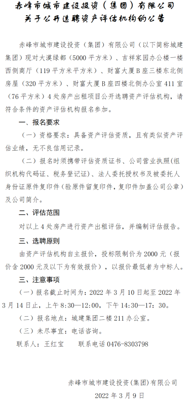 上一篇:赤峰市城市建設(shè)投資(集團(tuán))有限公司 關(guān)于公開選聘資產(chǎn)評估機構(gòu)的公告