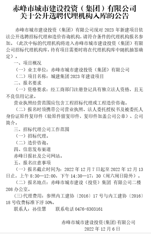 下一篇:關(guān)于赤峰市城市建設(shè)投資(集團)有限公司選聘建設(shè)項目可行性研究、社會穩(wěn)定風(fēng)險評估、環(huán)境影響評價編制單位入庫公告