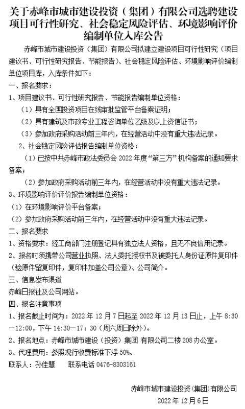 關于赤峰市城市建設投資(集團)有限公司選聘建設項目可行性研究、社會穩(wěn)定風險評估、環(huán)境影響評價編制單位入庫公告